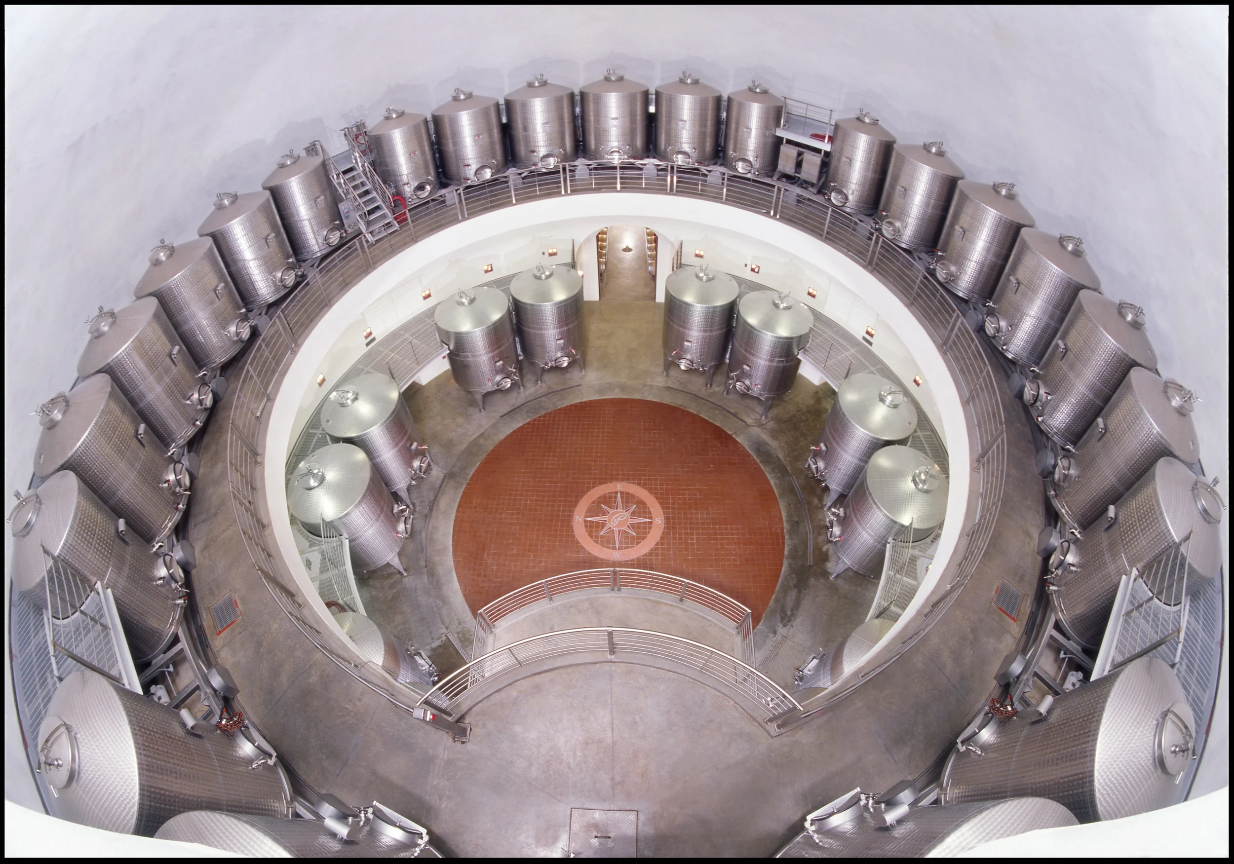 The Palmaz winery’s multi-level fermentation dome houses a carousel of twenty-four stainless steel fermentation tanks –one for each of their twenty-four vineyard blocks. The only one of its kind in the world, it guarantees isolation, and begins the gravity flow process by rotating directly beneath the sorting table to “bring the tanks to the grapes.”